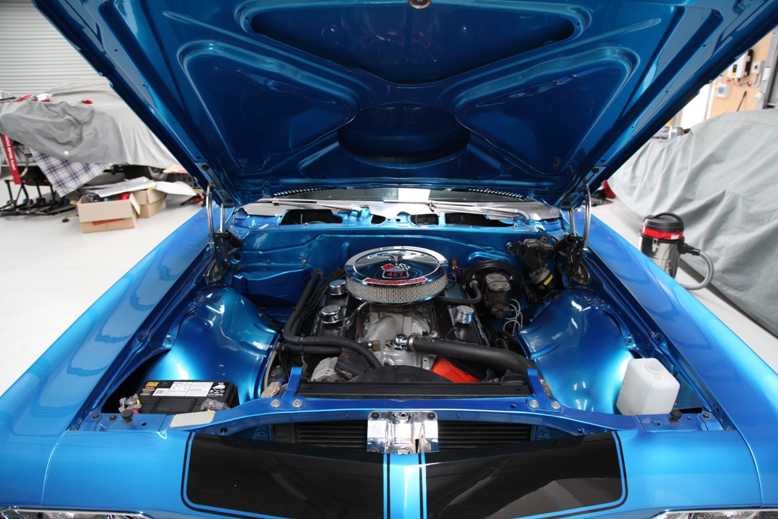 during the resto. It rolls on 20 x 10” and 18 x 8” inch Show Wheels (no rash), with low profile 235 and