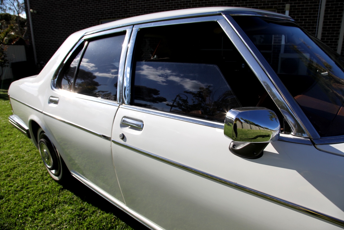 Custom stainless steel side body moldings were then added, modified HJ Caprice window frame chrome trims fitted, Chrome side mirrors and side indicators